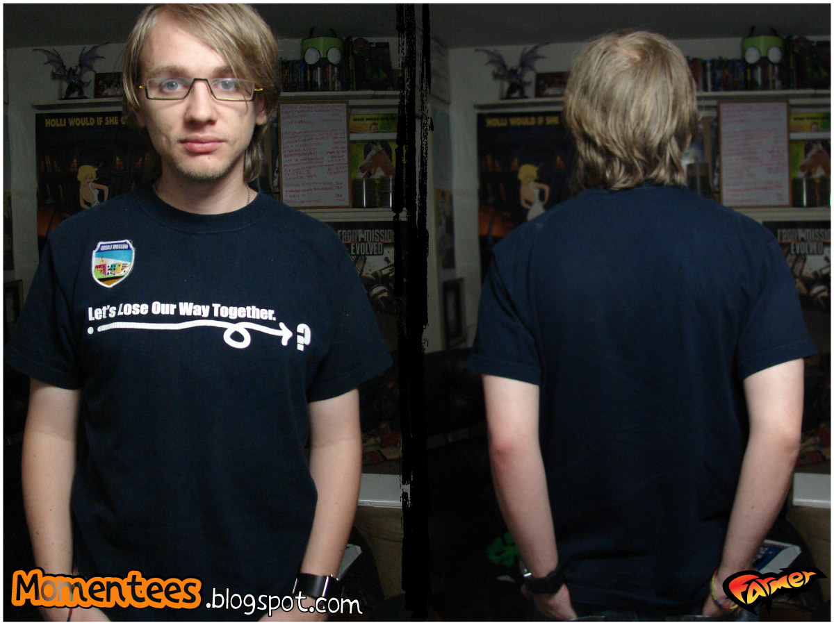 As I was saying, the simplicity of the message here is really what sets the design off. On the top right it has a patch from the museum which says "Ghibli Museum". The picture is a 9 color landscape of the exterior of the museum, complete with giant robot at the top -from Laputa: Castle in the Sky-. Across the chest it says, -in title caps- "Let's Lose Our Way Together". While it is a simple statement, and even a shorter sentence, it says so much. It captures the free-spiritednesss and feelings of exploration & discovery that the Studio Ghibli movies embody. Below the sentence is a line with an arrow on one end. It starts at a dot and ends at a question mark and sort of meanders its way across looping over itself once. This path is one of an open mind and heart, something I aspire to be and search for in others.